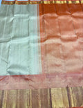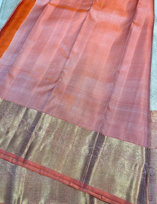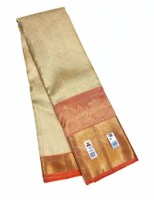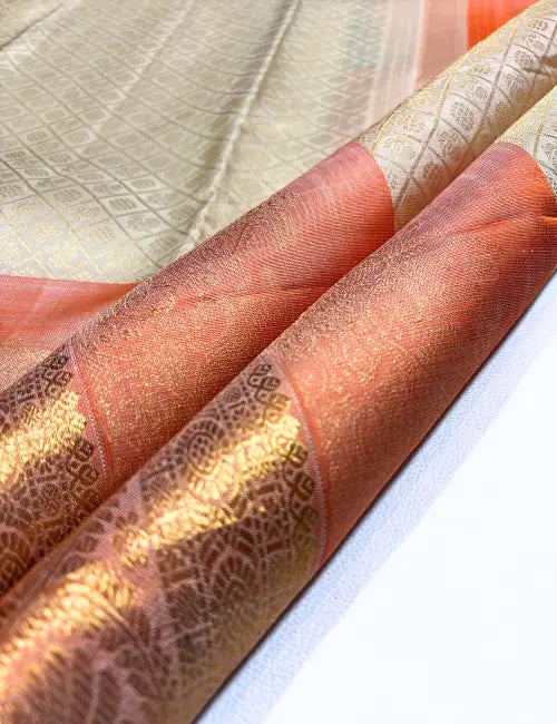 Off-White & Pastel Orange Kanchipuram Handloom Silk Saree with Peacock & Chakra Motifs
